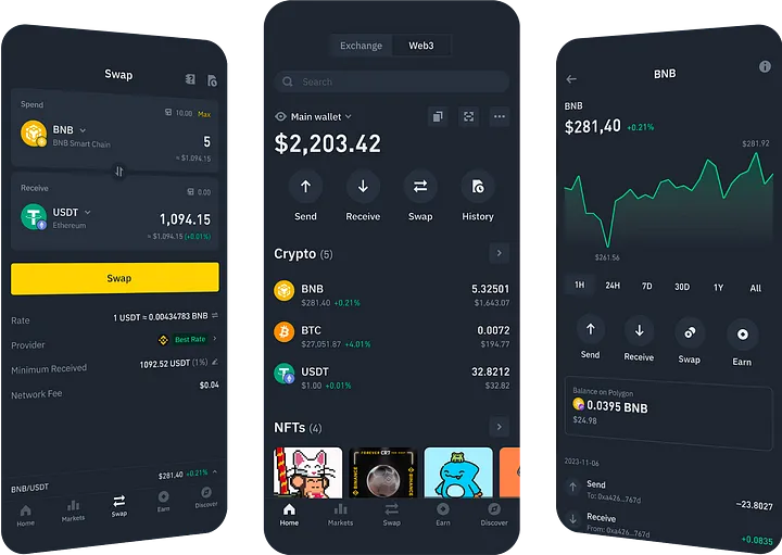 Obsługuje on 38 popularnych blockchainów, umożliwia wymianę tokenów za pośrednictwem DEX-ów i oraz pozwala przenosić aktywa pomiędzy sieciami za pośrednictwem Binance Bridge. Obsługuje również bezpośrednie transfery z Binance do Web3 Wallet i odwrotnie.