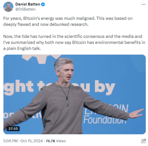 Zgodnie z danymi przedstawionymi przez Battena, Bitcoin jest obecnie „najbardziej zrównoważonym przemysłem energetycznym na świecie.” Około 57% energii potrzebnej do wydobywania Bitcoinów pochodzi z odnawialnych źródeł, takich jak energia słoneczna i wiatrowa. Jeszcze w latach 2020-2021 było to zaledwie 33%.