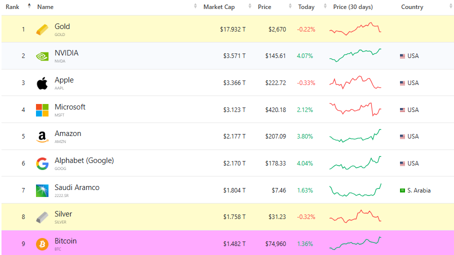 Mimo że Bitcoin robi znaczące postępy, nie zagraża jeszcze największym liderom rynku. Złoto, będące od lat najstabilniejszym aktywem, nadal zajmuje pierwsze miejsce z kapitalizacją przekraczającą 18 bln USD. Kolejne pozycje należą do firm technologicznych, takich jak NVIDIA (3,4 bln USD), Apple (3,377 bln USD) czy Microsoft (3,06 bln USD).