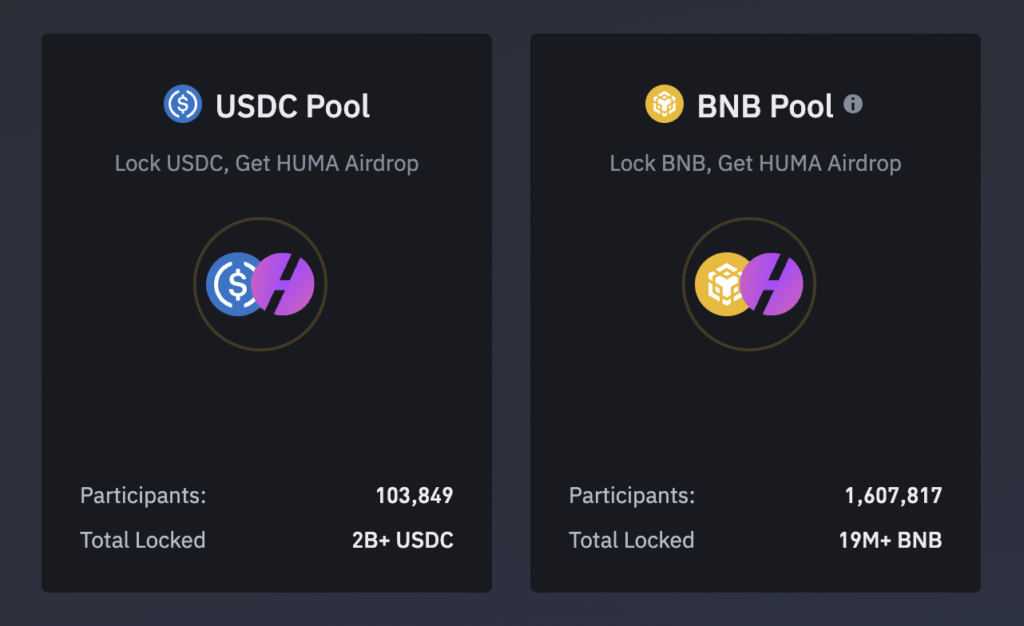 Użytkownicy mogą blokować BNB, FDUSD lub USDC, aby przez 3 dni farmić tokeny HUMA w ramach airdropu. Proces farmingu rusza 23 maja 2025 o 00:00 UTC, a zakończy się 25 maja o 23:59 UTC.