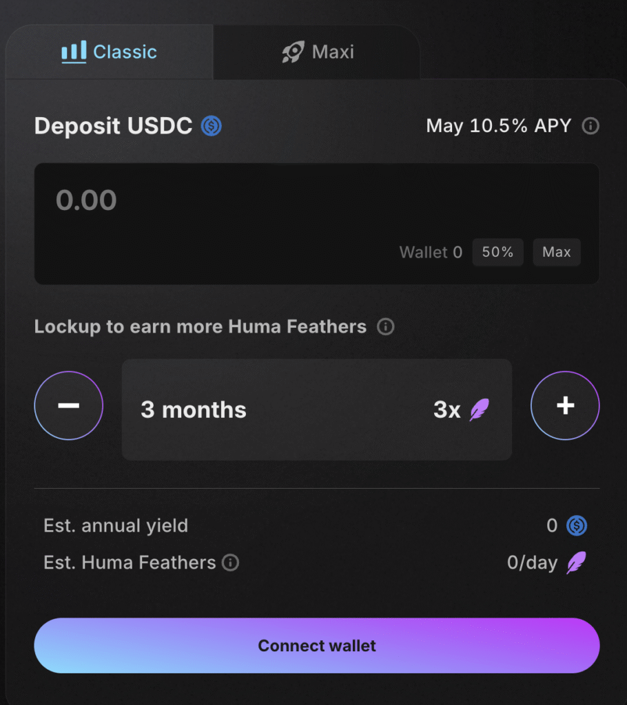 - Classic Mode – dla osób szukających stabilnego zwrotu w USDC. Obecnie wynosi on 10,5% rocznie. Oprócz tego użytkownicy zbierają Feathers, które przekształcają się później w $HUMA.