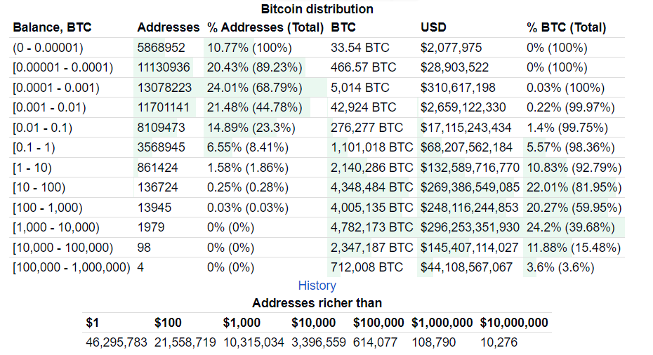 • Większość adresów posiada bardzo małe ilości Bitcoina. Najwięcej adresów (24,01%) mieści się w przedziale od 0.0001 do 0.001 BTC. Adresy te łącznie posiadają 5004 BTC, co stanowi zaledwie 0,03% całkowitej podaży.