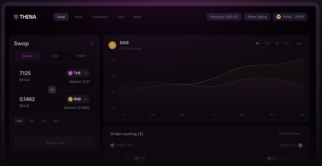 W skrócie, Thena to platforma DeFi, która pozwala użytkownikom: