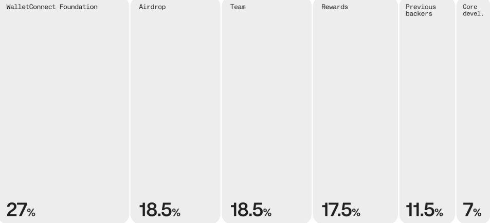 Największa część – 27% – trafia do funduszu WalletConnect. To zapas na przyszłe działania. Kolejne 18,5% trafi do zespołu projektowego, a drugie tyle zostanie rozdystrybuowane w formie airdropów.